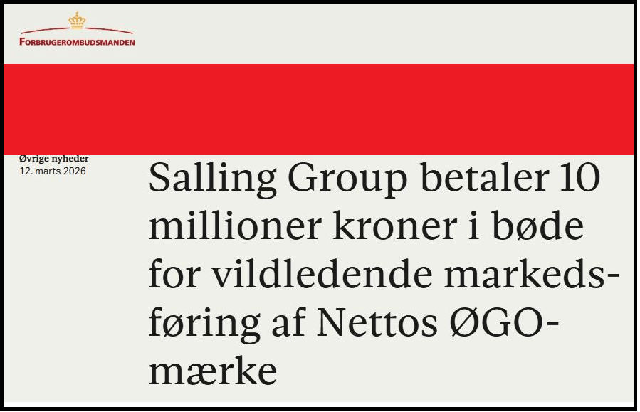 Netto har accepteret en bøde på 10 millioner kr. for vildledende markedsføring af produktserien ØGO. Salling Group A/S betaler dermed den hidtil største bøde i Danmark for greenwashing efter at have markedsført Nettos egen serie af økologiske produkter ”ØGO” i strid med markedsføringsloven.