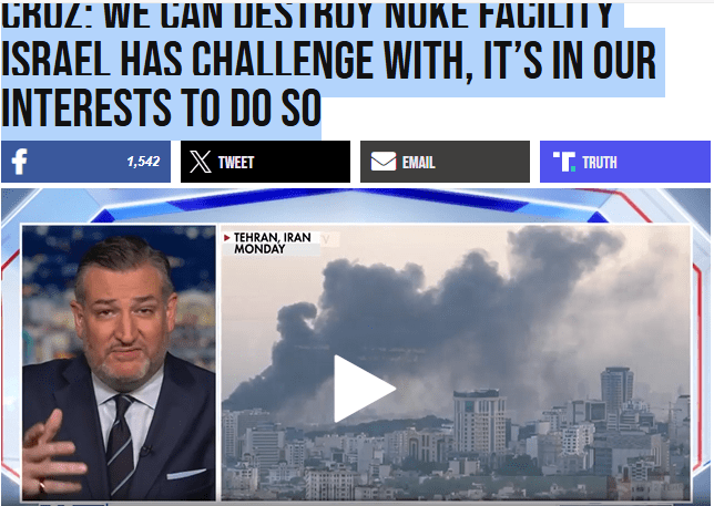 I tirsdagens udsendelse af Fox News Channel’s “Hannity” udtalte senator Ted Cruz (R-TX), at amerikanske bunker-buster-bomber kan ødelægge Fordow Iran-atomanlægget, som er det eneste sted, hvor Israel har “en teknologisk udfordring”, og “det er i høj grad i Amerikas interesse at se dette nukleare forskningslaboratorium ødelagt.”