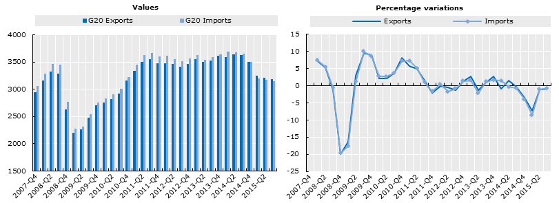 Den internationale handel i G20-landene fortsatte med at falde i 3. kvartal af 2015. Industrilandenes økonomiske samarbejdsorganisation OECD, har netop offentliggjort G20 International Merchandise Trade Statistics, hvor man kan læse, at eksporten fra og importen til EU faldt for femte kvartal i træk, målt i dollars og korrigeret for sæsonmæssige udsving.