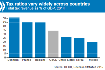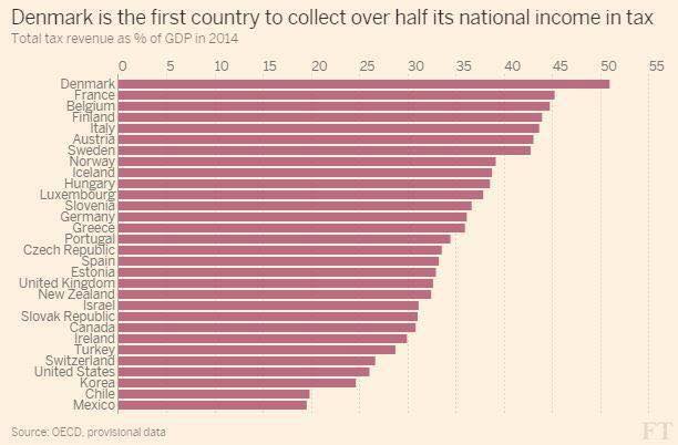 Skattetrykket på 34,4 pct. er det højeste siden OECD begyndte at opgøre skattebyrden i 1965. Den største stigning fra 2013 til 2014 var ikke overraskende i Danmark med 3,3 pct. og Island med 2,8 pct. Danmark har med 51 pct. af BNP det suverænt højeste skattetryk blandt alle OECD-landene.