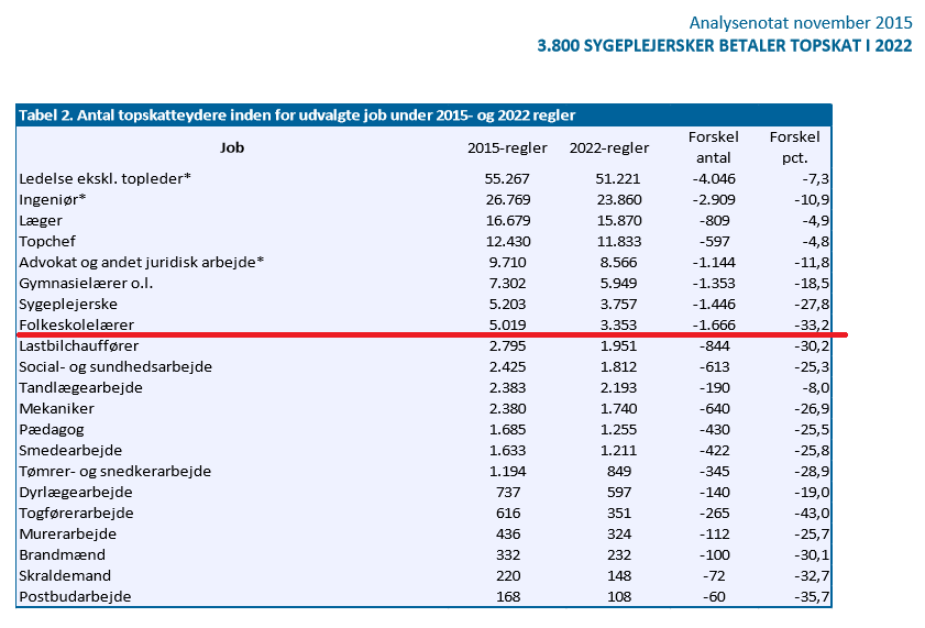 Ifølge tænketanken CEPOS betaler næsten en halv million danskere topskat, og masser af mennesker i almindelige job kommer over topskattegrænsen på 467.300 kr. Hvor rimeligt er det, at over 5.200 sygeplejersker og 5.000 skolelærere rammes af topskatten og betaler en marginalskat på godt 56 pct. til staten. Det samme gælder 2.700 lastbilchauffører, 1.685 pædagoger og 220 skraldemænd. Topskatten på 15 pct. af indkomst over 467.300 kr. betales af godt 500.000 skatteydere, dvs. 10 pct. af alle skatteydere. Statens provenu fra topskatten anslås til 15,5 mia. kr. i 2015.